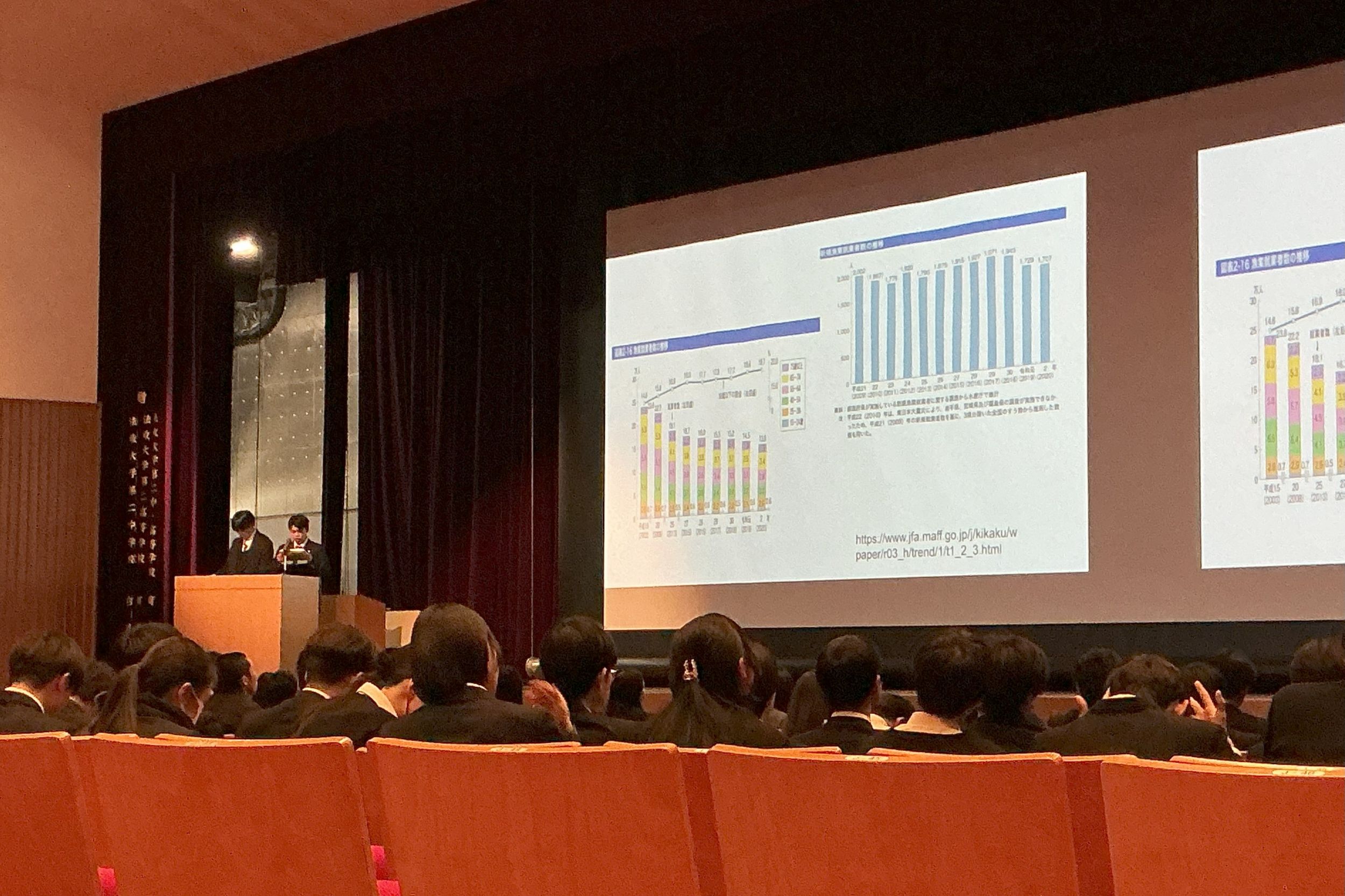 法政大学社会学部からは金井明人教授、糸久正人教授にお越しいただきました。教授からの鋭い質問に戸惑う様子も見られましたが、自分たちの知識を総動員して答えようと努力する姿が印象的でした。「質問をすること」の大切さは生徒たちの心にも響いたのではないかと思います。