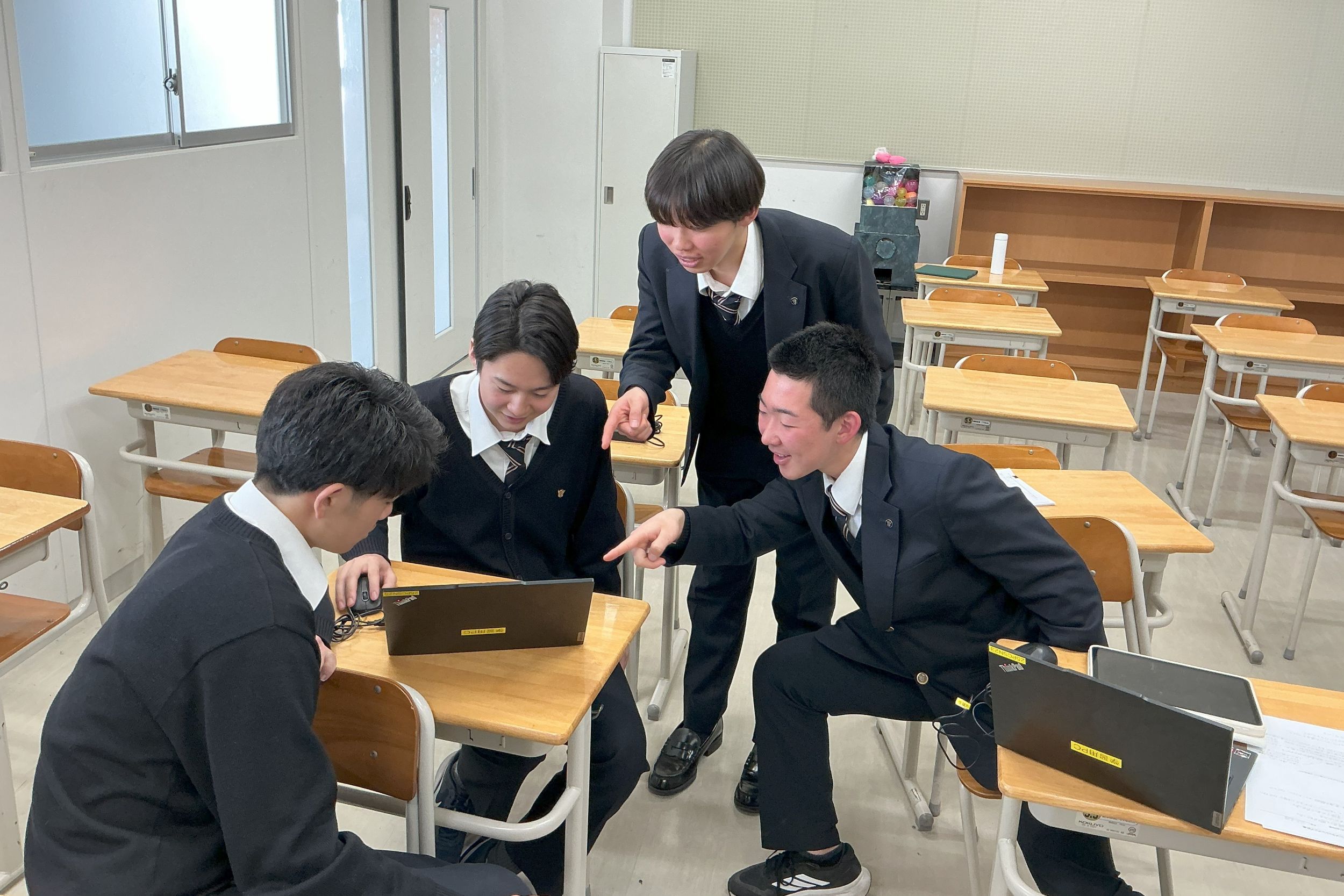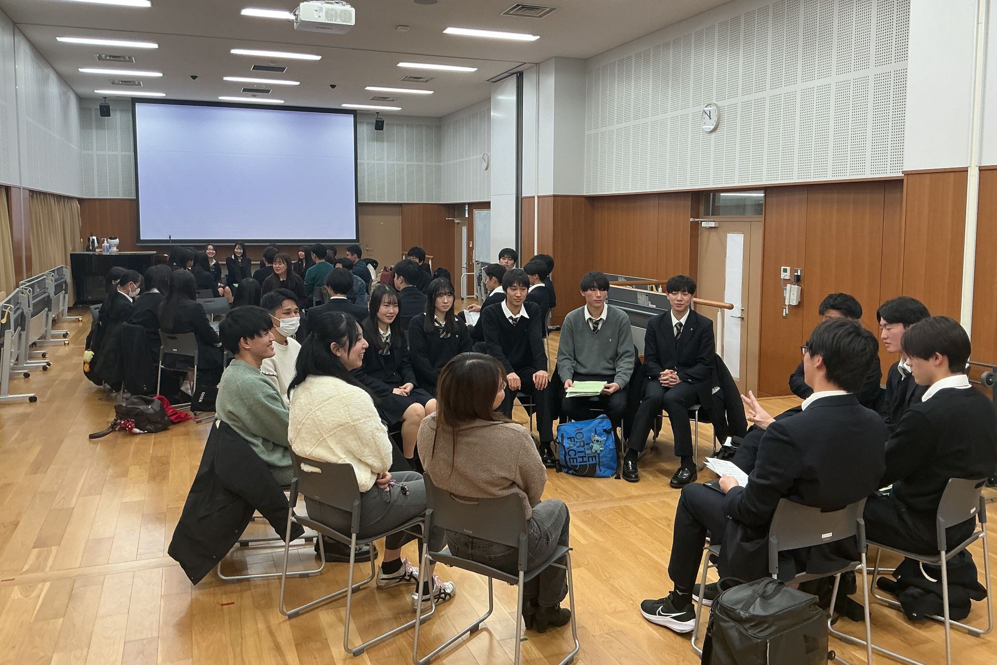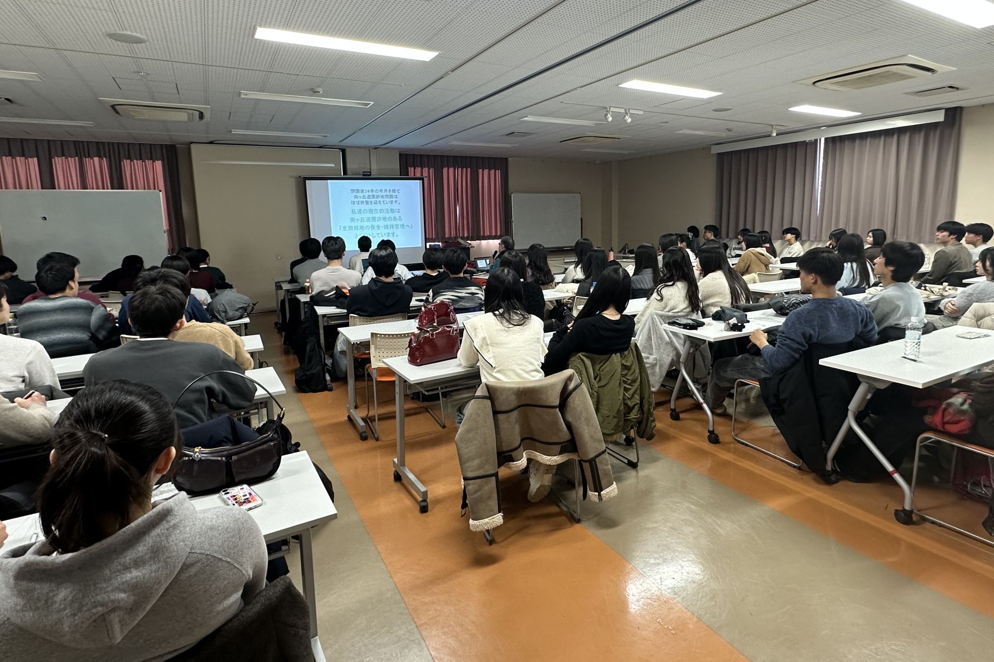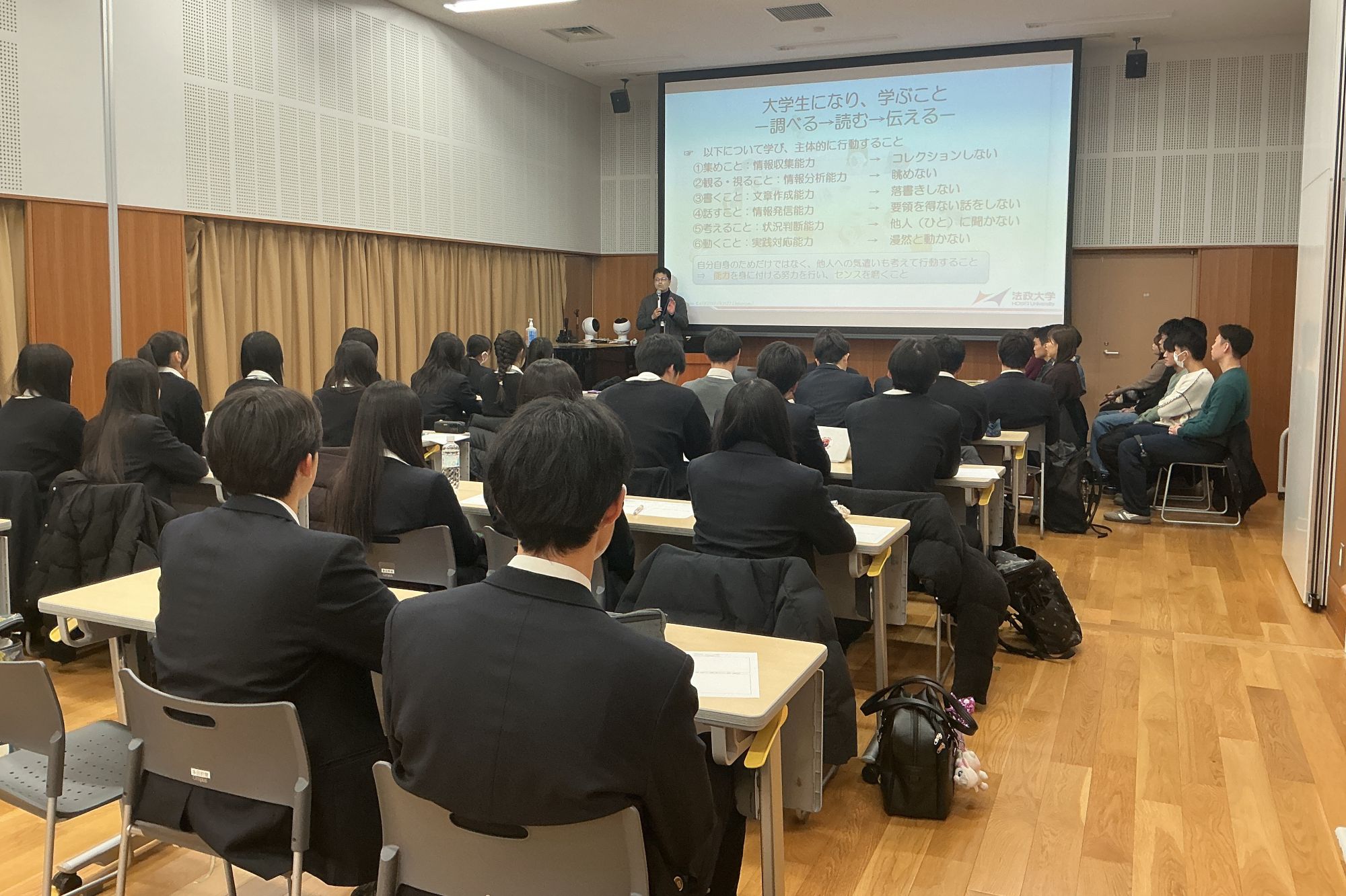 1月15日には、人間環境学部教授の金藤正直先生とゼミに所属する本校卒業生たちが来校しての講演会を開催しました。まず、金藤先生から、人間環境学部の内容だけでなく、大学生活、どのような人間像に成長してほしいかなど、多岐に渡るお話をいただき、その後、卒業生から大学生活やゼミ活動についての話しを全体講演として聴講しました。そのあと3つのグループに分かれ、各班のプレゼン大会に向けた研究テーマについてのアドバイスをいただきました。本校卒業生のゼミでのいきいきとした様子を見て、今年度のクラスからもすでに金藤ゼミで活躍したいと思い、モチベーションが高まった生徒が出てきました。