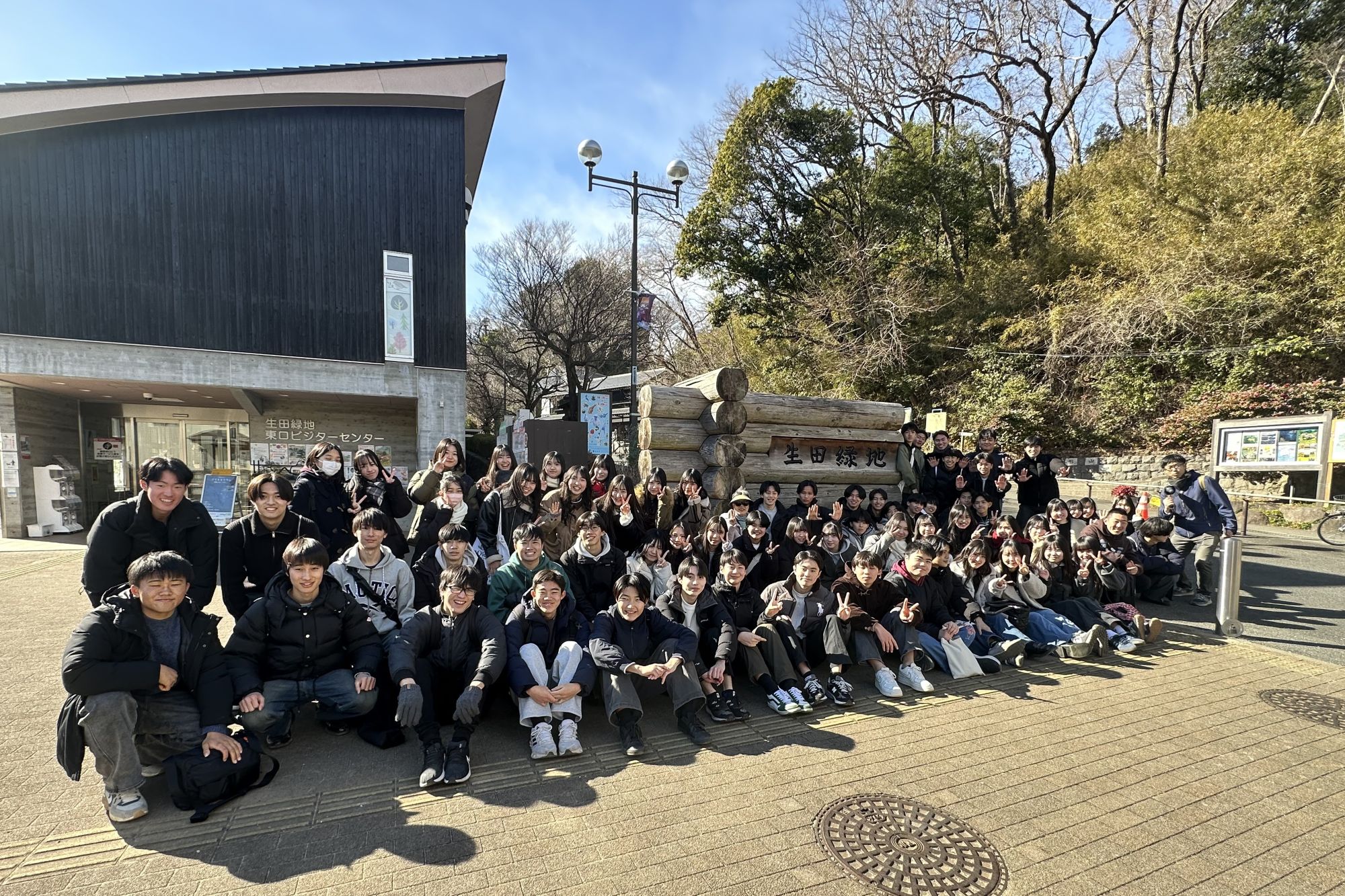 1月22日には、「向ヶ丘遊園跡地保全運動と生田緑地」をテーマに、向ヶ丘遊園の緑を守り、市民憩いの場を求める会(遊園の会)の方々の案内のもと、生田緑地内を踏査しました。今年度は、人間環境学部、文学部地理学科、キャリアデザイン学部と合同の総勢60名を超える大規模FWとなりました。まず、遊園の会の松岡嘉代子さんによる講義を全体で受講しました。「人」と「自然」が持続的に共生するための開発とは何かについて、生徒たちは真剣に耳を傾けていました。その後の生田緑地・向ヶ丘遊園跡地踏査では、山道を歩く場面もあり、生田緑地に残っている自然と在りし日の遊園の跡を大いに体験でき、天気にも恵まれ緑地散策を満喫することができたようです。