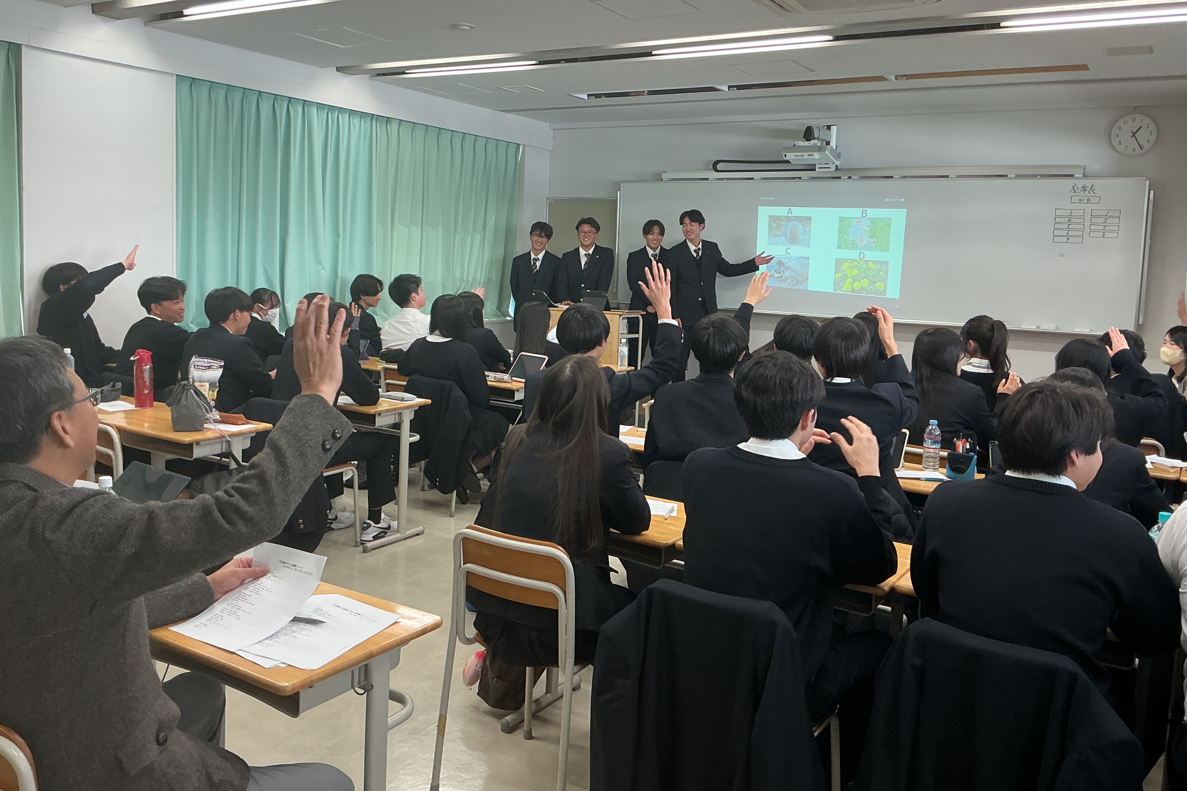 各班、それぞれ工夫をこらして、テーマの現状、問題点、解決策について分析・提案し、お互いに質問して議論しあうことができました。当日は、法政大学人間環境学部から櫻井洋介先生、文学部地理学科から前杢英明先生にお越しいただき、各班に講評とアドバイスをいただきました。7週間という短い取り組みでしたが、アドバイスいただいた点は、きっと大学での学びに繋がる貴重な経験となりました。