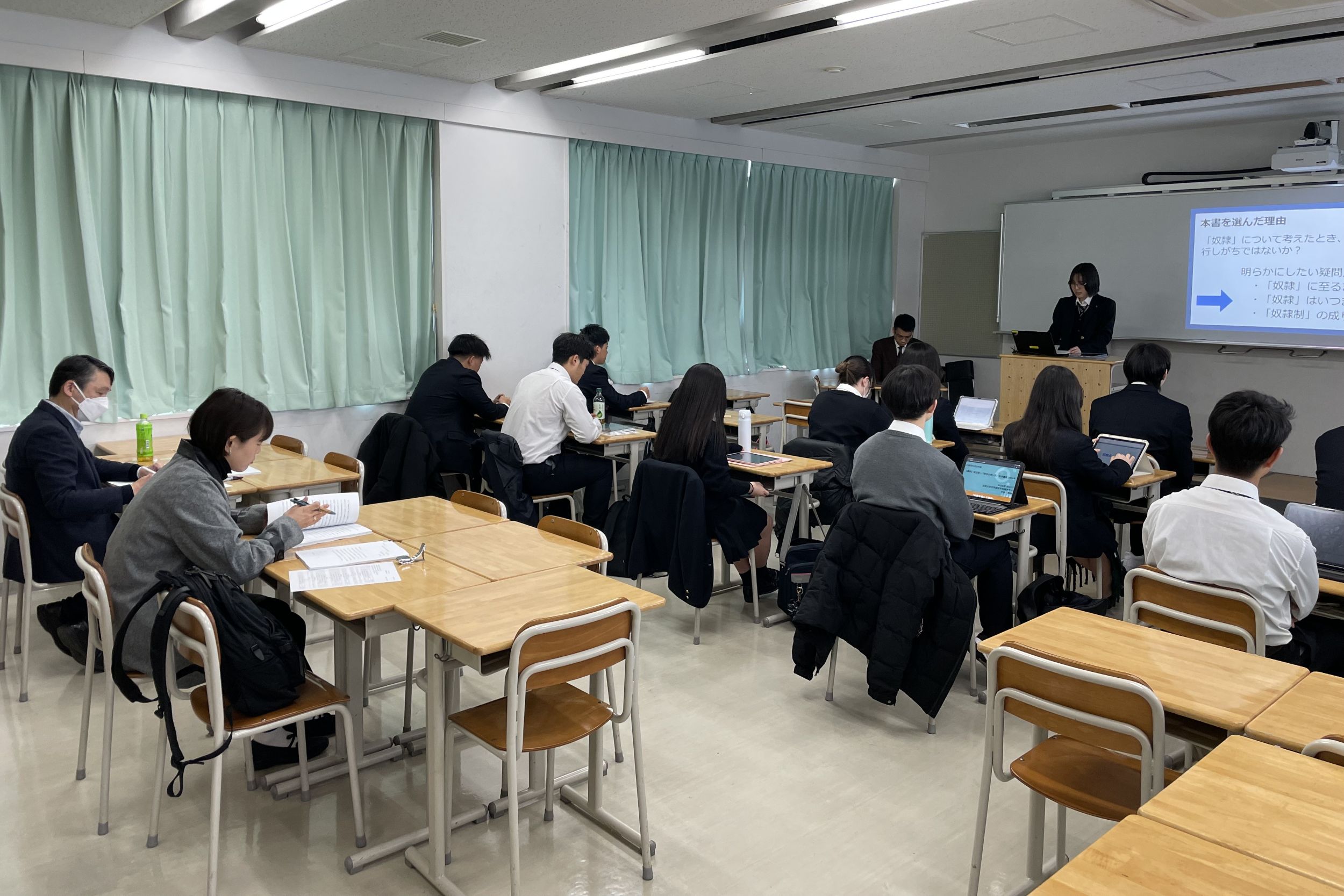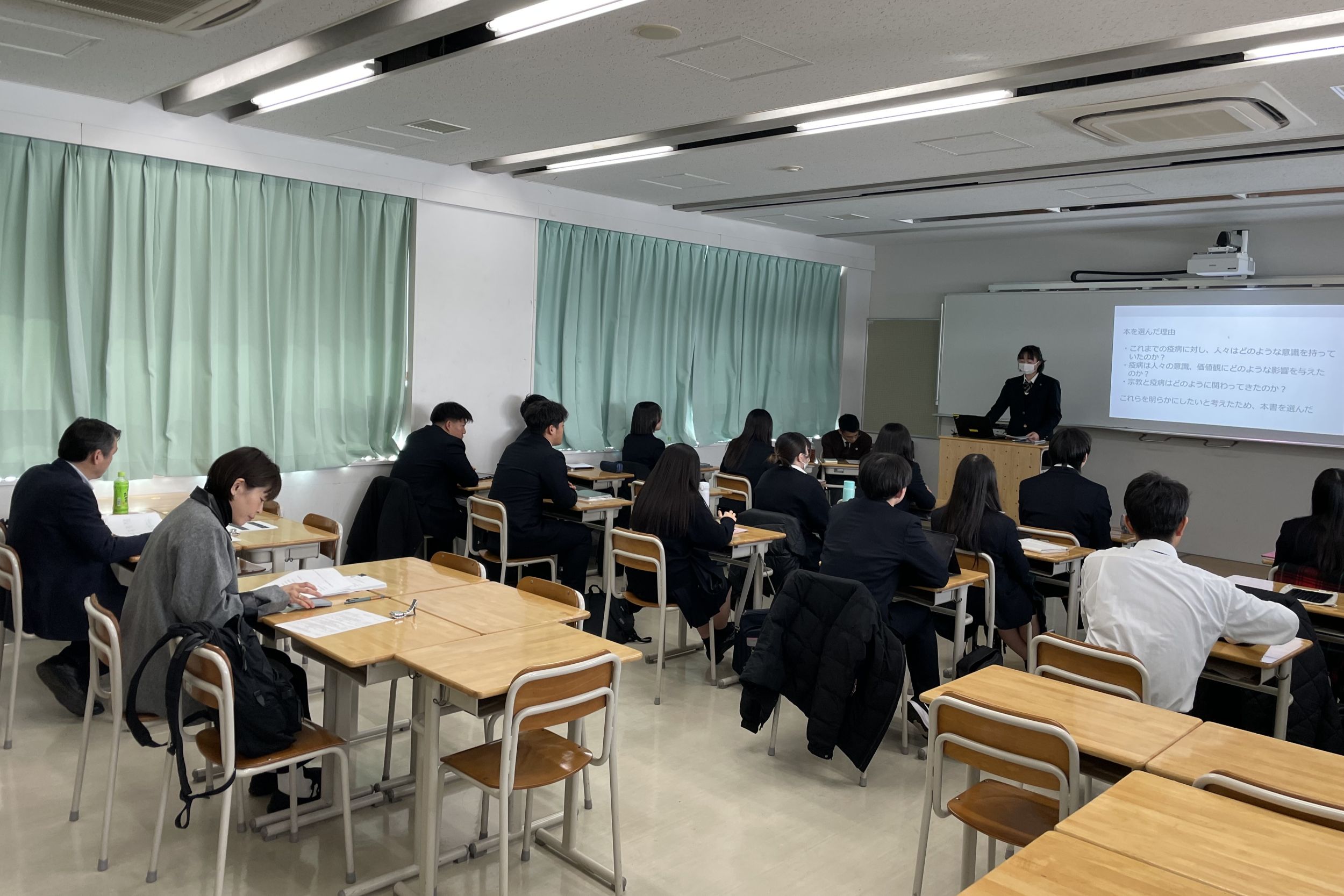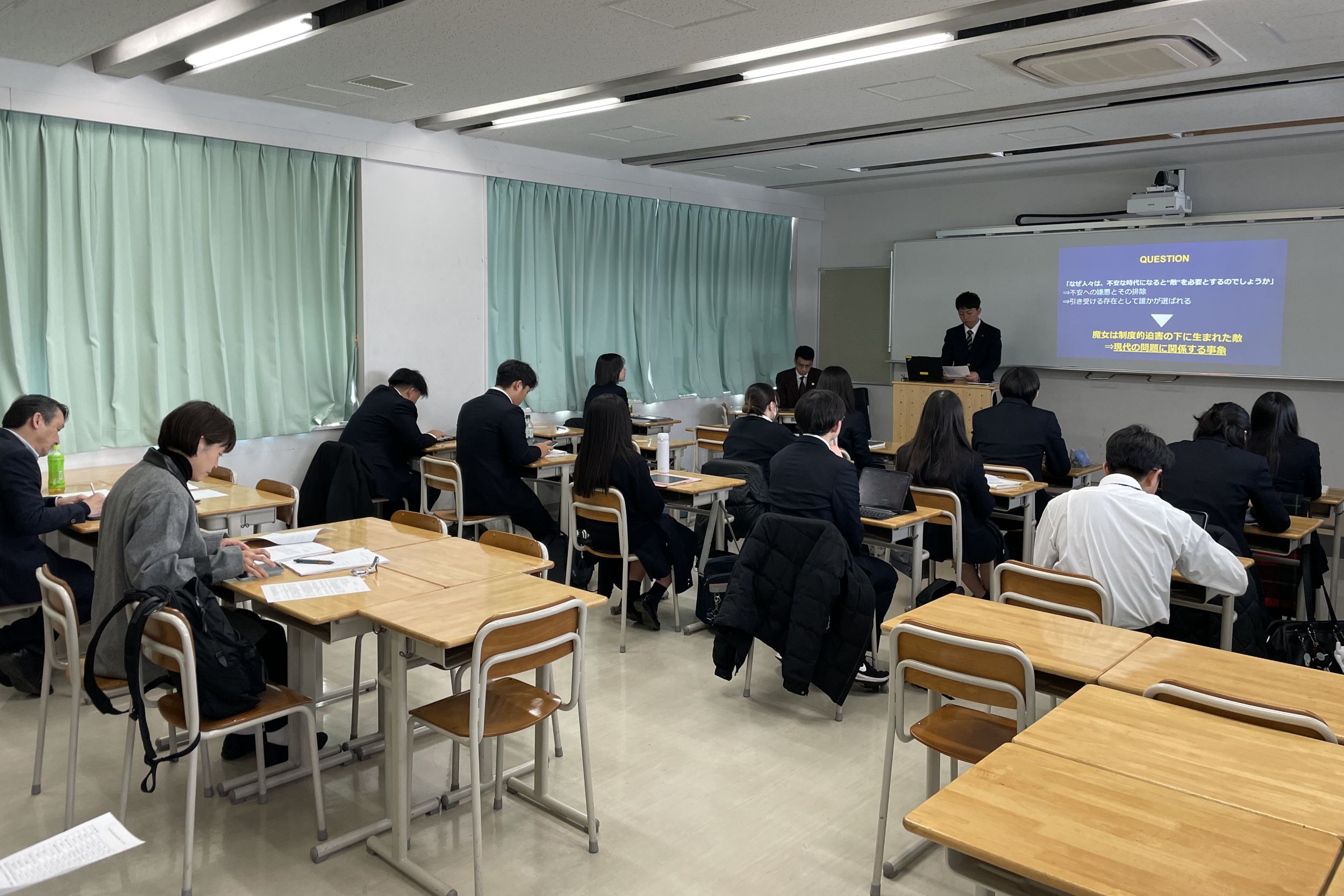 生徒は,「普段とは異なる環境」での報告,質疑・応答を経験し,大学教員からは,これまで「解答が有る質問」ばかりで育ってきた生徒に対し,「解答が無い質問」をし,「何故,そのように考えるのか」など,「正解とは何か」を考えさせる質問がなされました。加えて,「史学」・「哲学」を学ぶ意義,大学で何を学びたいのか,など今後に繋がることも話していただきました。
