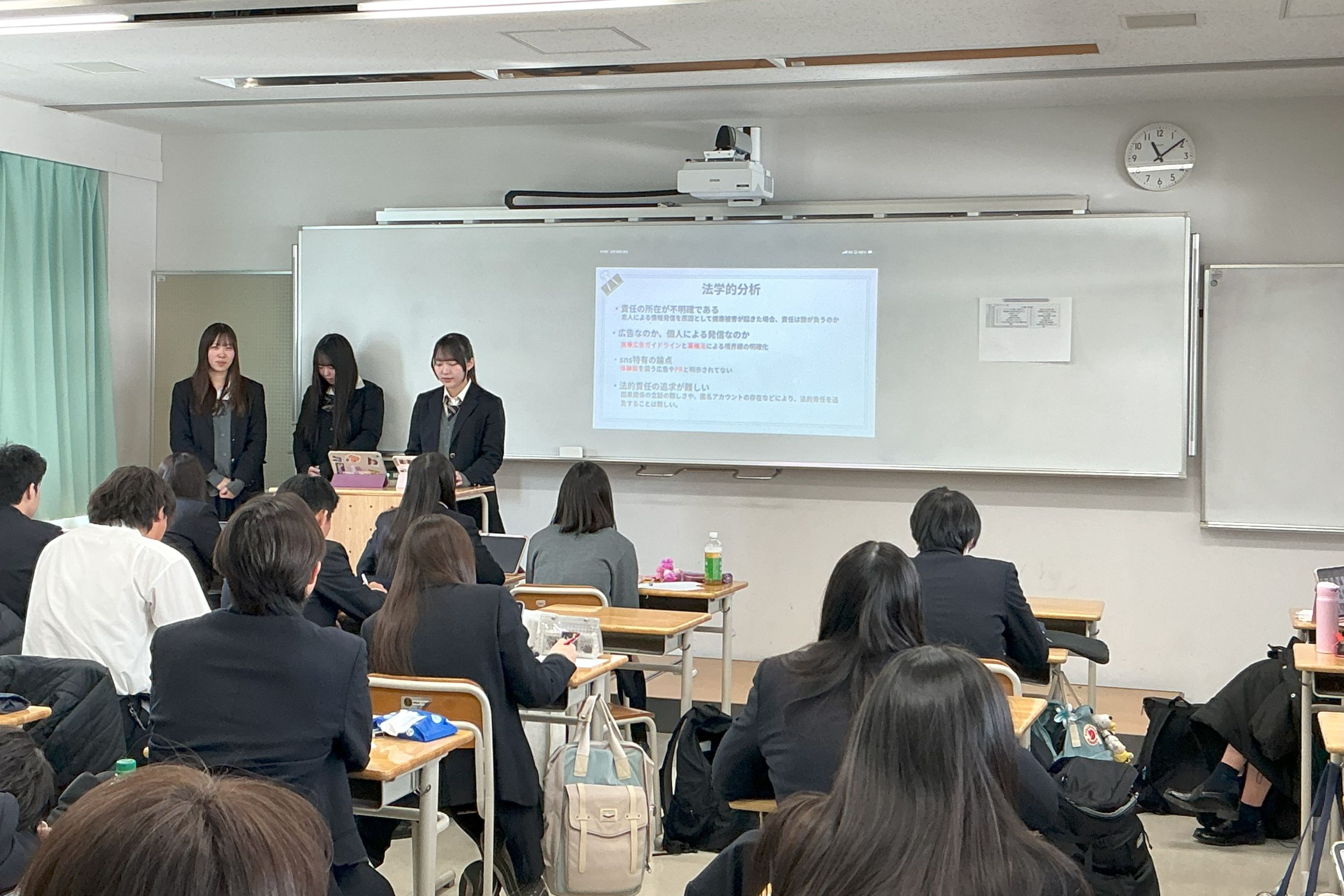 法政大学社会学部からは金井明人教授、糸久正人教授にお越しいただきました。教授からの鋭い質問に戸惑う様子も見られましたが、自分たちの知識を総動員して答えようと努力する姿が印象的でした。「質問をすること」の大切さは生徒たちの心にも響いたのではないかと思います。