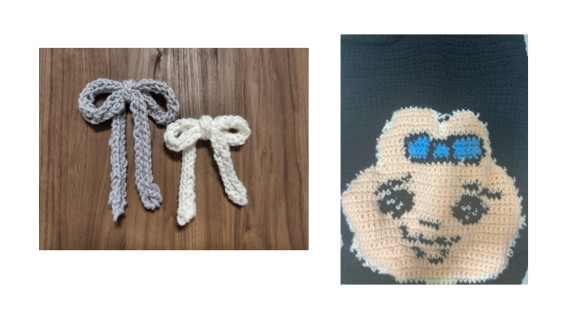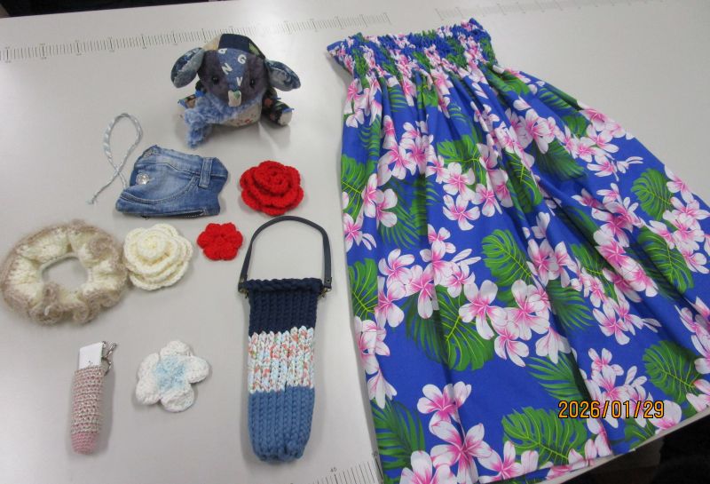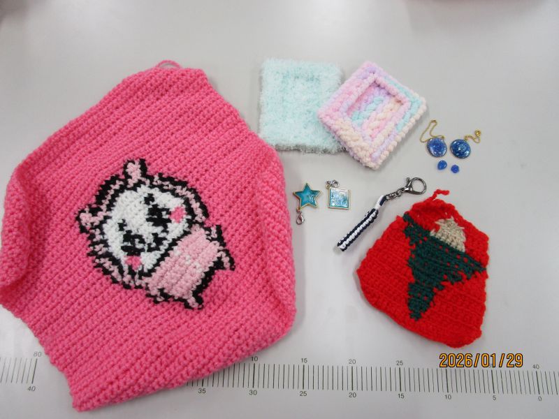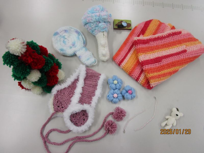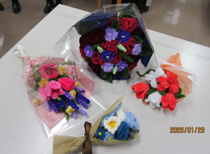 モールや編み物で作った花束や、毛糸のポンポンを使った作品、ビーズやミシン作品、編み物作品など、多岐にわたった作品が報告され、これからの作品作りの良いヒントになりました。