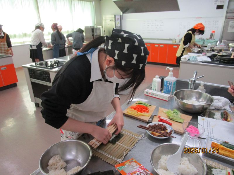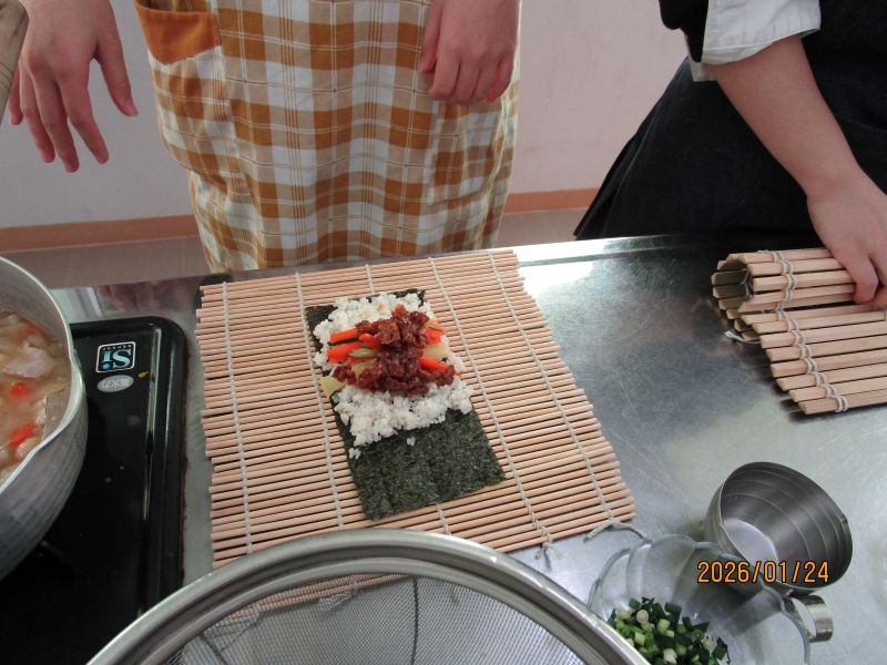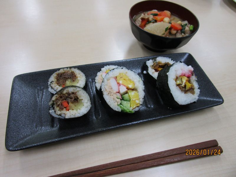 1月の調理は、2月の節分を意識して献立を考えました。「太巻き、キンパ、サラダ巻き、鬼除け汁」