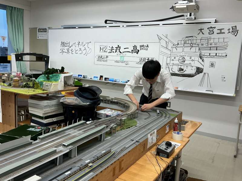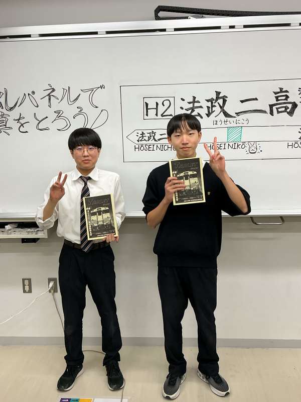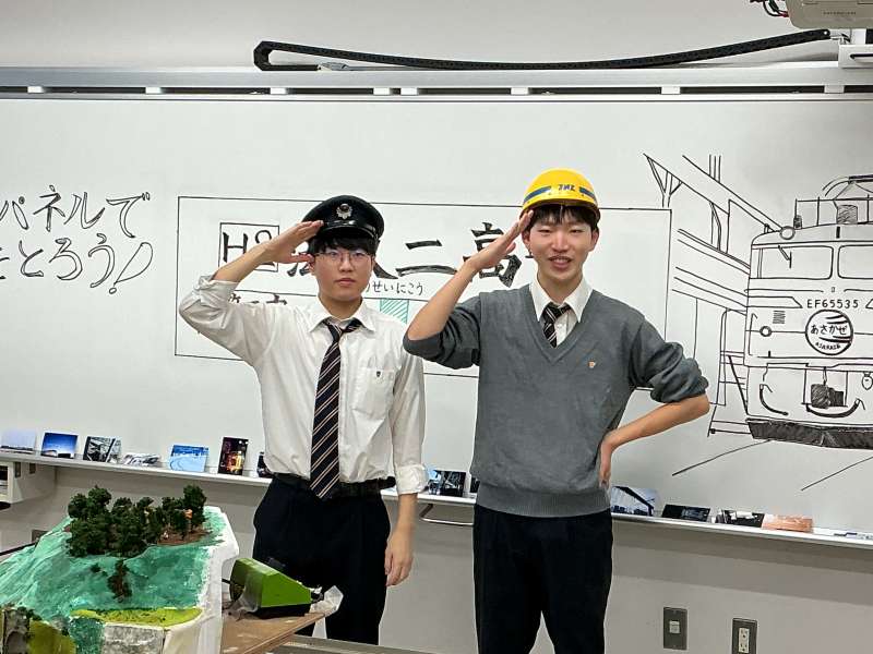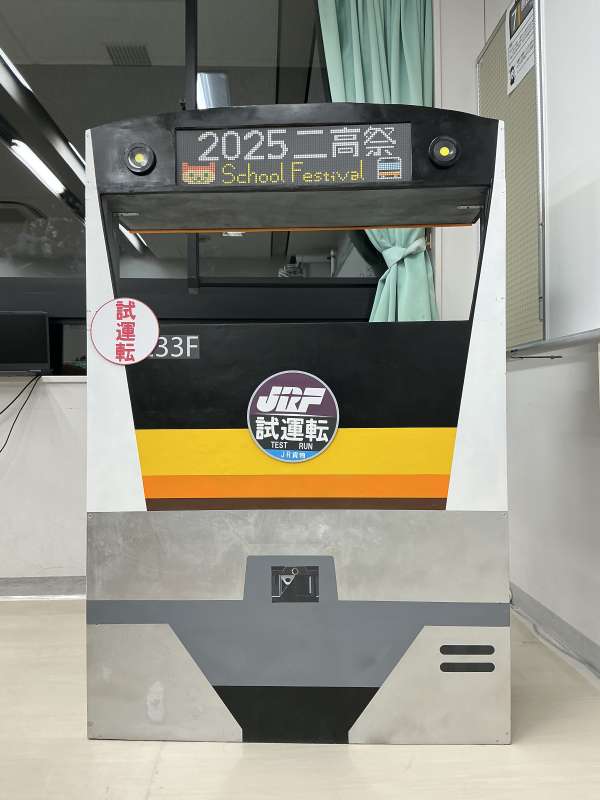 そして、新企画のふたつめは、これまでベールに包まれていた、あの「謎の物体」です。いよいよ皆さんのお目にかける時がきました。なんと、観光地などでよく見かける、あの「顔出しパネル」を作っちゃいました。しかも、これまた二中高生になじみのあるJR南武線。JR南武線E233系運転台から顔を出し、写真撮影をすることができます。