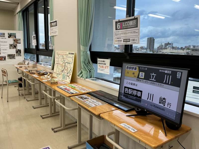 新企画のひとつは、JR南武線のLCD展示。LCDとは車内案内表示器のことで、車内の次駅案内や乗り換え案内、運行情報などに用いられます。JR南武線の立川発川崎行のLCDを再現し、皆さんに南武線乗車の疑似体験をしていただきます。