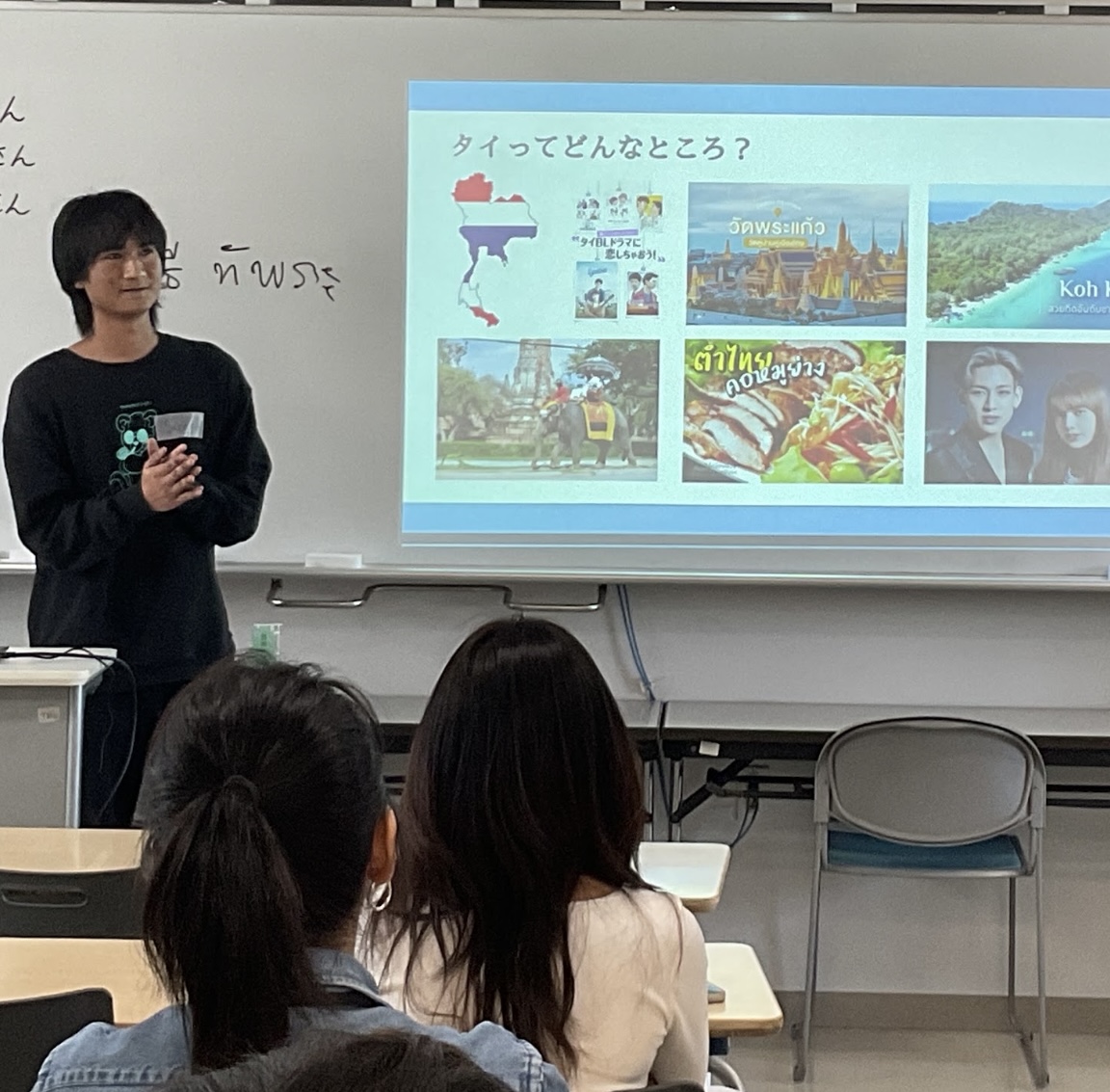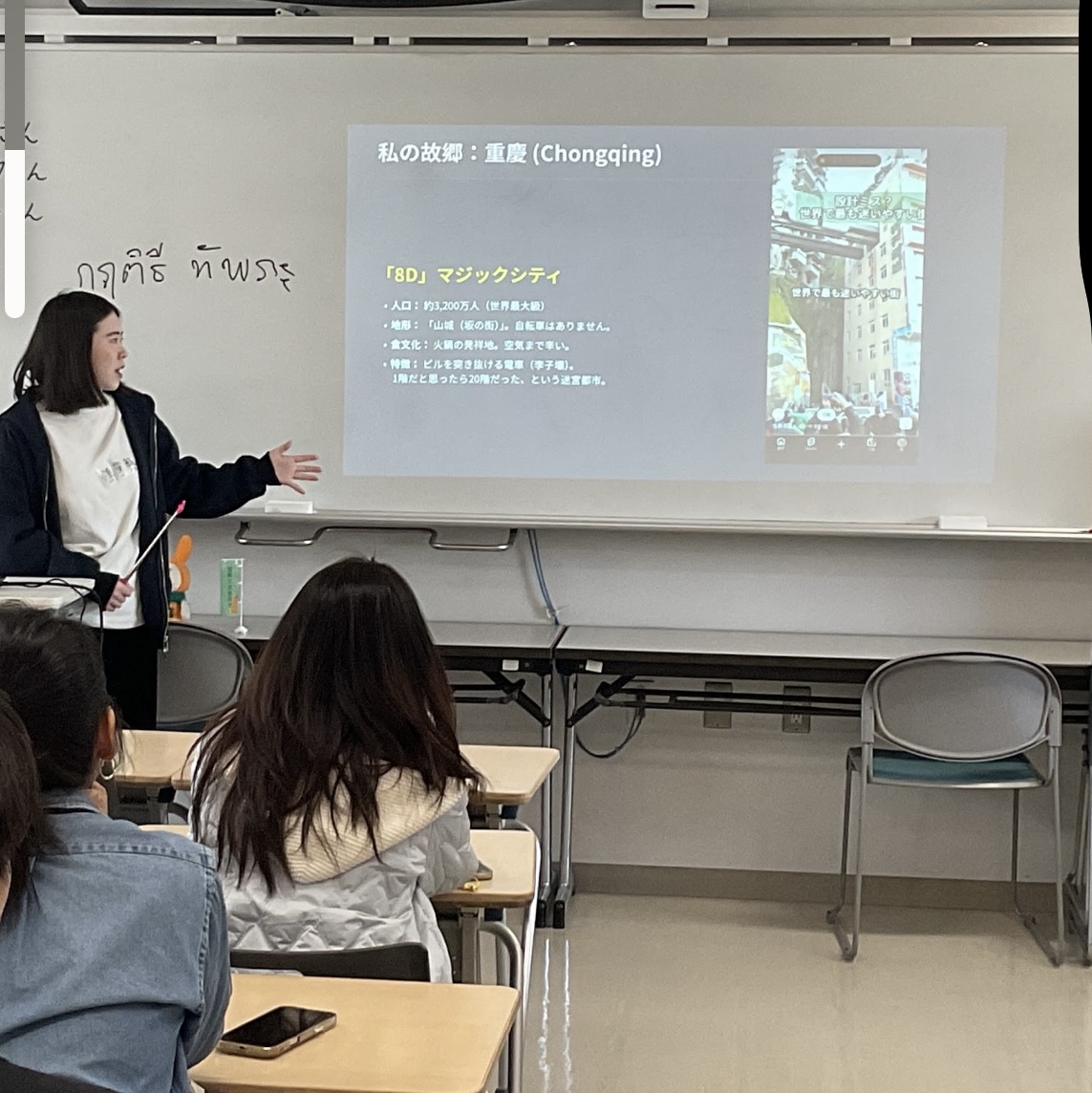 2月28日(土)にタイ・中国・ベトナムの方をお招きして第2回アジア教室を開催しました。タイの発表ではタイの学校生活について教えていただきました。タイの子供たちは学校まで親にバイクで送ってもらうことやテスト前に良い成績が取れるように「ガネーシャ像」にお祈りをする習慣があることを教えていただきました。中国は発表された方の出身地、重慶の紹介でした。重慶はとてもユニークな街で、鉄道、モノレールがビルを貫通していたり、高層ビルの屋上に巨大な運動施設があったりなど迷路のような場所だということです。夏はとても暑く、50℃になることもあるそうです。ベトナムの発表ではベトナムの食べ物や生活習慣について教えていただきました。北部は塩辛い料理が多く、中部は辛い料理、南部は甘い料理が多いそうです。アオザイという服をよく着て、ファッションにも冠婚葬祭にも用いられるそうです。また、バイクに乗れることが「大人の証」と考えられているそうです。