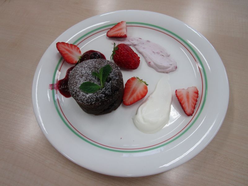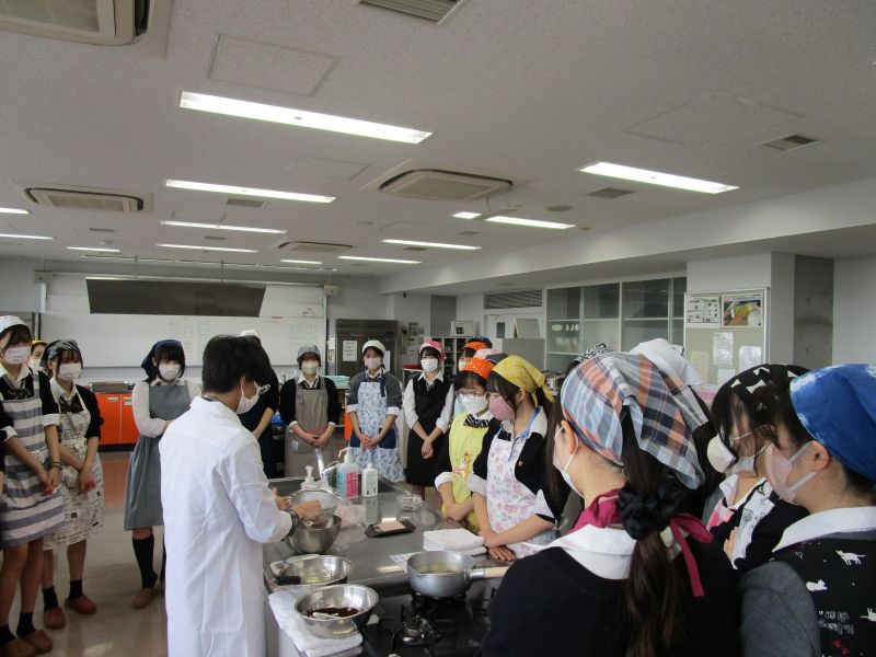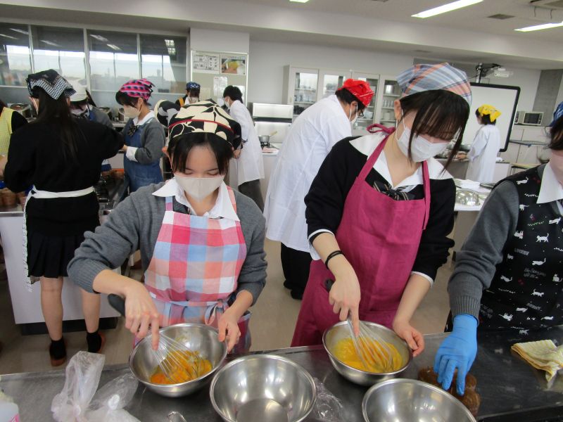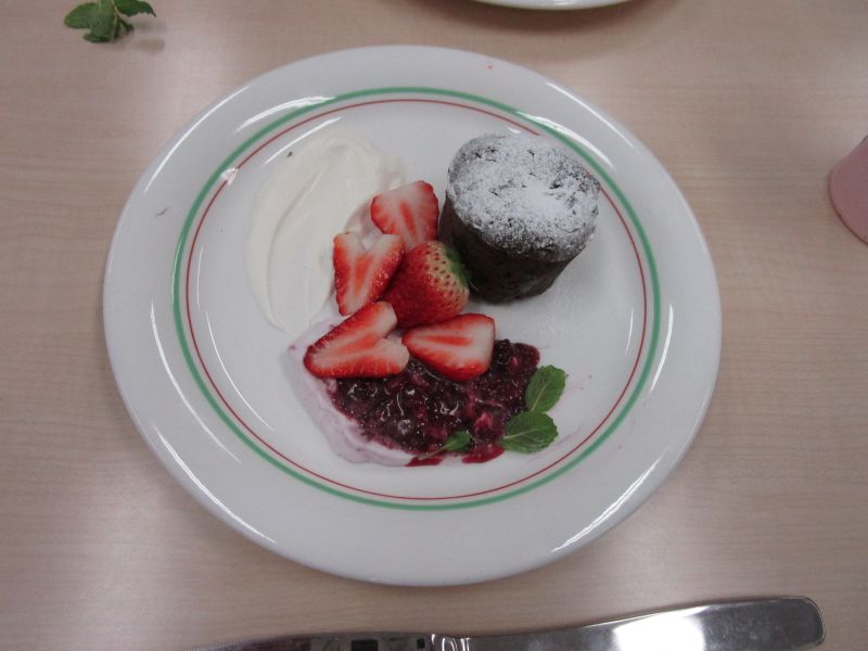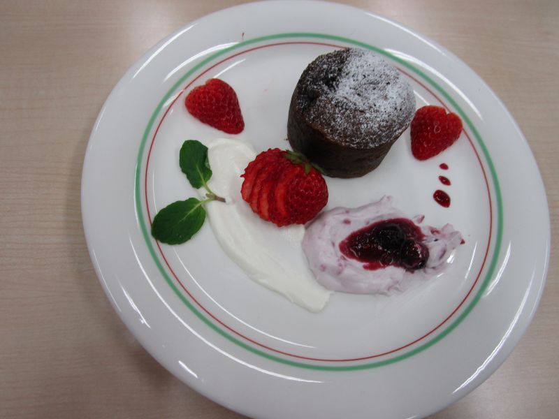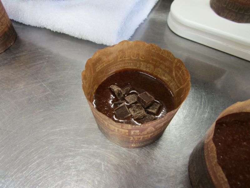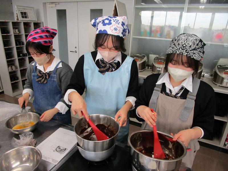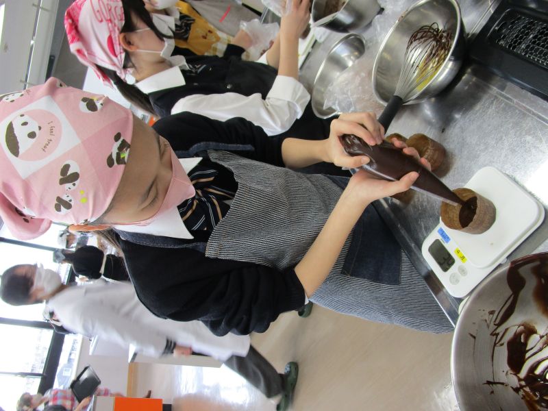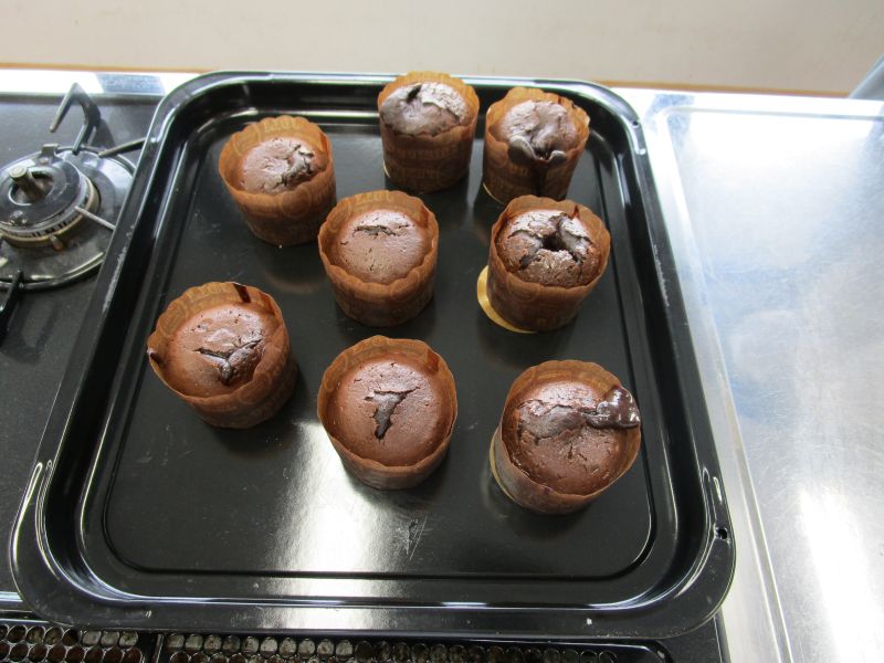 焼き上がりで若干チョコがあふれ出した班もあり、生地のチョコと卵液の混ぜ方の大切さを学びました。