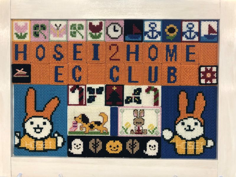 家庭科部の部活動ブログのサムネイルは、過去に部員全員で作ったブラジル刺繡です。現在は、新入生歓迎や文化祭などのたびに、教室の出入り口に飾られ皆さんを出迎えています。