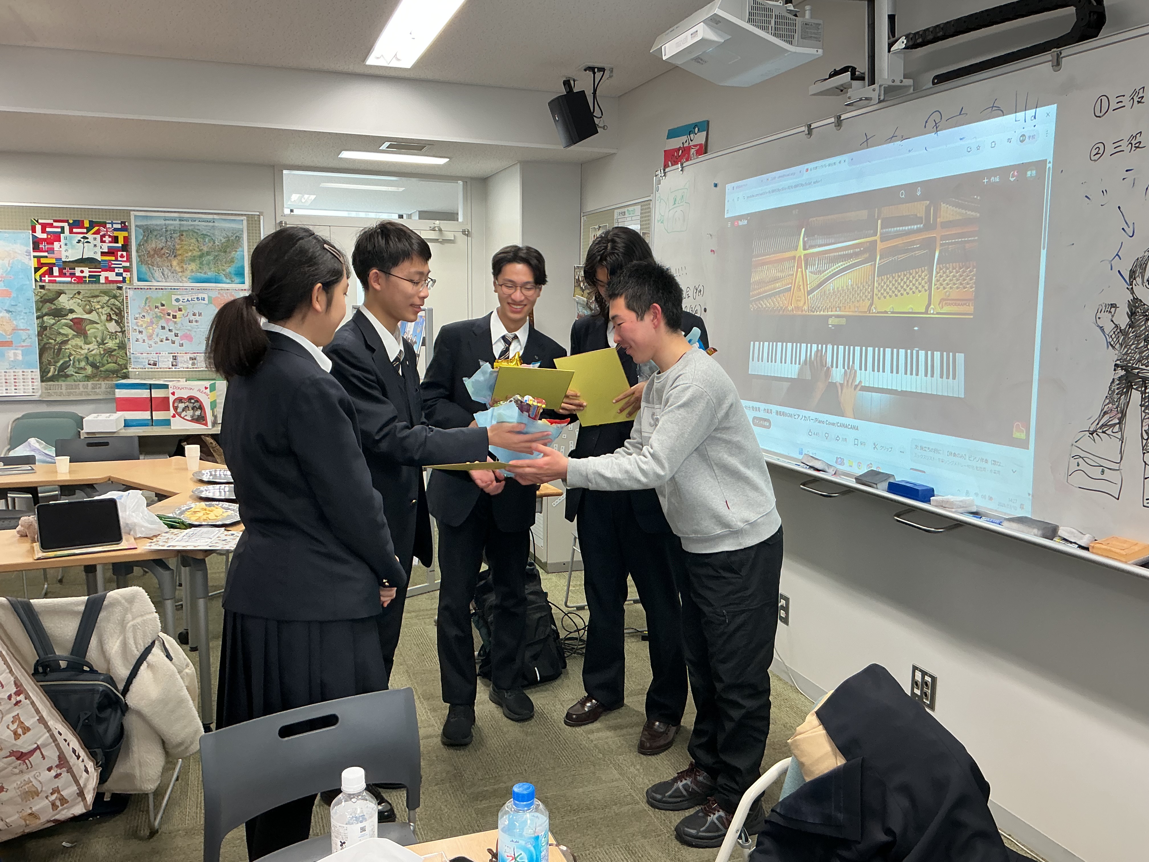 3月10日(火)に、国際交流委員会で高校3年生を送る会を行いました。お菓子を食べながら歓談し、在校生、卒業生が一人ずつ挨拶をしました。色紙・贈り物の贈呈と写真撮影を行い、最後に「旅立ちの日に」をみんなで歌ってお別れしました。昨年度は、コロナの影響で低迷していた委員会の活動を活性化するべく、委員長・副委員長・マネージャー、そして先生方が協力しながら活動を続けた結果、現在では多くの人が国際交流委員会のイベントに参加するようになりました。また、新たに「日本語教室」という、留学生に日本語を教える企画を立ち上げ、留学生がより有意義な留学生活を送れるようになりました。さらに、日本語を学んでいる外国人や地域の日本語ボランティアの方々、卒業生、保護者、他校の生徒なども招き、さまざまな人たちとの交流の輪を広げることができました。この約1年間で、委員会の活動は大きく活性化しました。そんな3年生も、いよいよ卒業を迎えます。これからは自分たちが主体となり、3年生の意志を引き継ぎながら、さらに新しいことに挑戦していきます。3年生の皆さん、また遊びに来てくださいね。