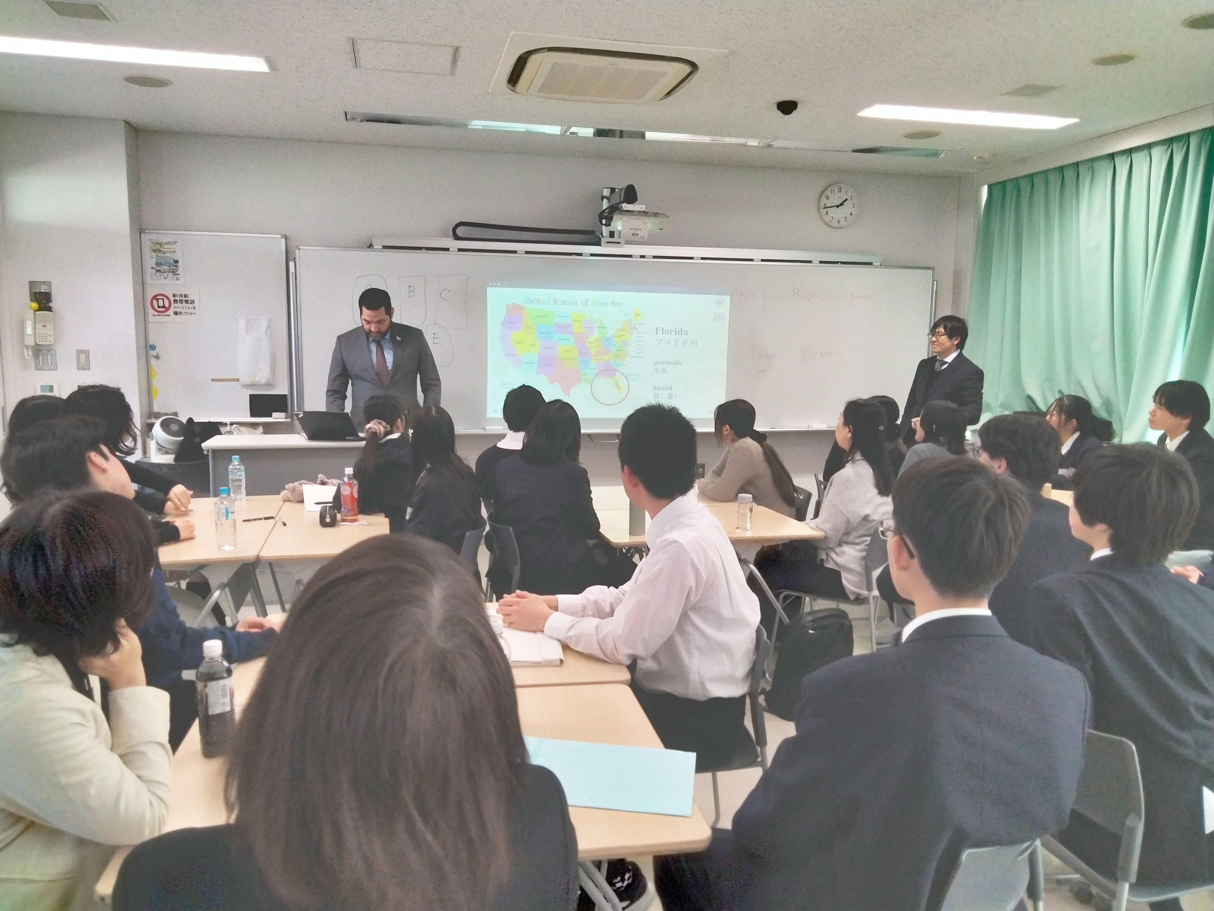 3月12日にアメリカ大使館に務めていらっしゃる外交官の方が来校され、アメリカ合衆国についてお話をして頂いたり、参加者同士の交流をしたりしました。 外交官の方のプレゼンテーションでは、外交官のお仕事の内容からアメリカ合衆国の歴史や食文化、年中行事、観光スポットに至るまで幅広い内容で、易しくゆっくりとした英語で分かりやすくお話してくださいました。ちょうどイースターの季節ということで、イースターエッグ探しも行いました! 私たちのたどたどしい英語にも耳を傾けてくださり、外交官の方の温かさを感じました。今回のセミナーには、本校の生徒以外にも、保護者や卒業生、他校の生徒たちも参加されたため、様々な方々との輪を広げることができて嬉しかったです。 国際交流委員会では、生徒たちの視野を広げることを目的として多様な人たちと出会う機会をこれからも追求し、交流の輪を広げていきたいです。