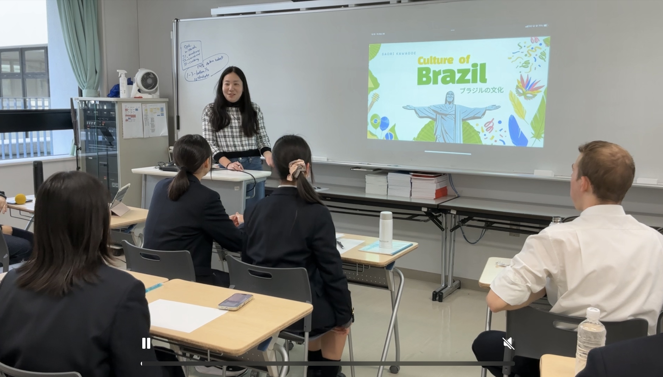 その後、本校の国際交流委員が日本語や日本の文化を教える「日本教室」を開催し、生徒が一から作った完全オリジナルのスラングプレゼンやクイズ、言語の壁を超えた状況説明問題などを通して、楽しみながら講師の方々、来場者の方々との交流ができました。今回は、日本語ボランティアに携わる地域の方や、9月にボランティア参加した「ブラジルクエスト in 小岩」でお世話になった方、生徒の保護者の方にも参加していただくことができ、様々なバックグランドをもつ方々との交流が実現しました。