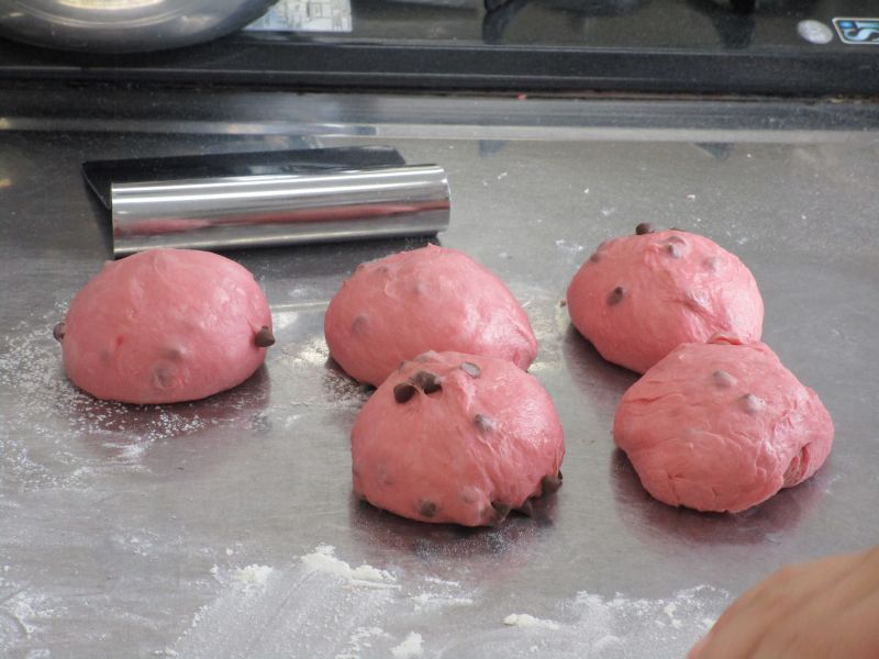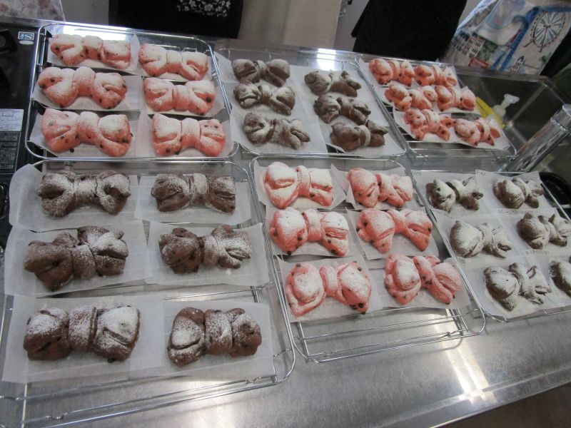 パンの色を赤、ピンク、カカオなど選ぶことができ、3人1組で好きな色のパンを作りました。